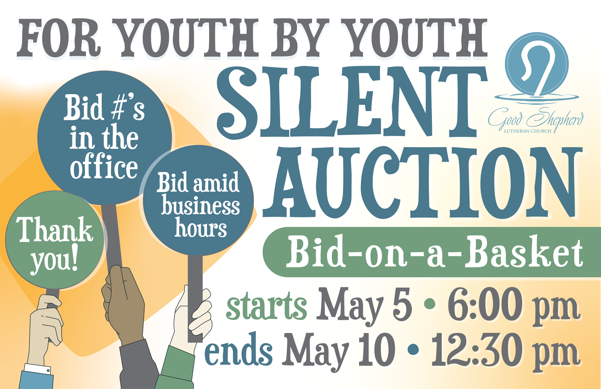 Grad. Recognition/Youth Led Worship: Wed., May 6 • Sat. & Sun., May 9 & 10 with Silent Auction: Tues. - Sun., May 5-10